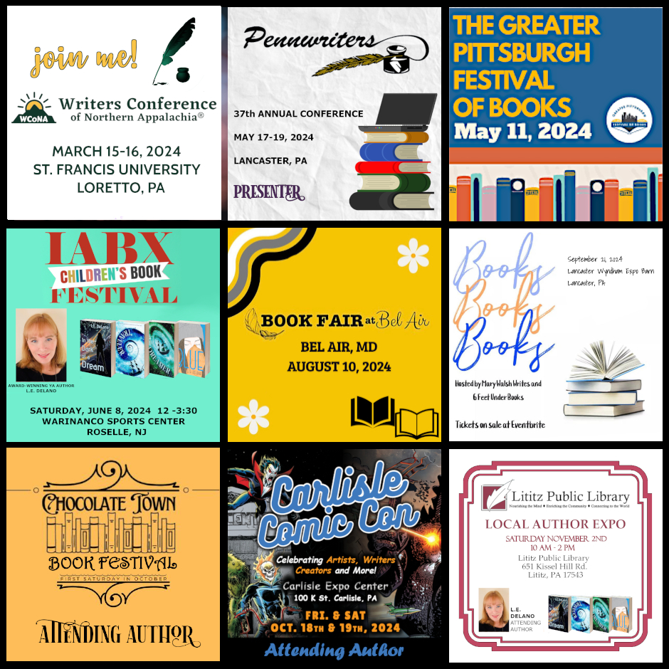Just a quick look at the book launches and events I have set for 2024 (so far). I’ve got the re-release of TRAVELER & DREAMER out near the end of this month, once all the interior and ebook formatting to reflect the new publisher is complete. Then I have IN THE DARK OF A DREAM launching in April. Along with that I’ll be attending several book festivals (and adding more as they come), and I’m happy to announce that I’ll be presenting a workshop at this year’s annual Pennwriters conference. It’s going to be one fun and busy year and I’m excited for all of it!
